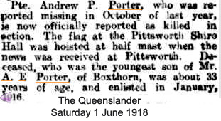 | Roll of Honour - Andrew Petrie Porter Service number: 5398 Rank: Private Unit: 26th Battalion (Infantry) Service: Australian Army Conflict: 1914-1918 Date of death: 9 October 1917 Place of death: Belgium Cemetery or memorial details: Ypres (Menin Gate) Memorial, Belgium Source: AWM145 Roll of Honour cards, 1914-1918 War, Army |