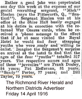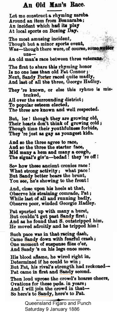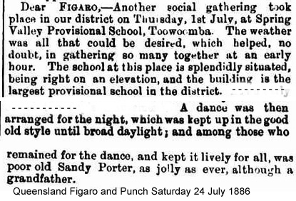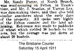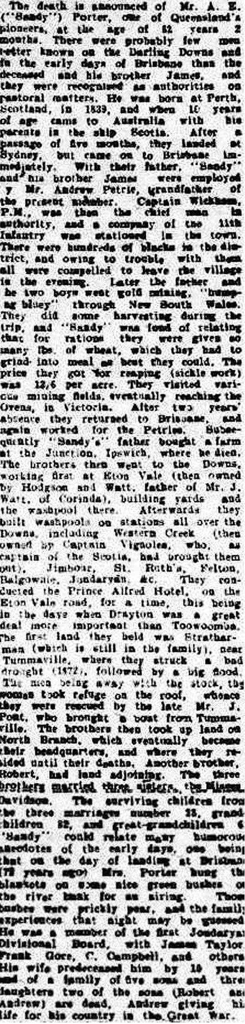 This anecdote is from a series written by Roy Porter and published for family members (courtesy Ross Porter) Uncle SandyThe Porter brothers - James, Sandy and Bob - had the name of being hard men to deal with - Grandma Margaret Marshall called them "kittle cattle ", whatever that may mean in English - but Sandy was the toughest of the trio. It was Sandy who opposed the payment of wages to the small army of sons – eight of James' and five of his own - that formed most of the work force of the partnership's properties. It was Sandy who masterminded the keeping of coloured fleeces of the black sheep in the Porter flocks, and having them made up into brown suits by Cribb & Foote, the Ipswich weavers - a "cacky brown" the 15 young Porter lairs called the colour. It was Sandy who caused the first break in the Porter's workforce. This came about when Alex, James' eldest son, was appointed manager of "Elgin and "Scrub Paddock" properties, as well as receiving reams of advice from James and Sandy, he was also given a cheque book to finance the operations. But, alas, "easy come, easy go" seemed to be young Alex's motto and he lavished the firm's cash on a spanking sulky and thoroughbred, with which he wooed and won - sometimes with disastrous after-effects - a succession of South Burnett beauties. Of course, all good things have an ending, and Alex was brought home in disgrace. His father gave him a tongue lashing, but Sandy used his stout walking stick. Alex's young manhood rebelled at this assault, and he threw Uncle Sandy into the nearby washpool, packed his bag, and left home. (He became assistant superintendent of the Westbrook Home, and eventually retired to Wooloowin with Aunt Frances and his family -Cecil, Grace and Stanley). I remember being a passenger in Uncle Sandy's Buick roadster on a trip from Pittsworth to "Boxthorn", his family property. Uncle's favourite perfume was Johnny Walker, and he had evidently used it lavishly. Uncle and I sat in the rear seat, with grandson Norman driving. In his high spirits, the old chap wanted speed and more speed. "Faster, boy, faster!" he urged Norman, emphasising his wishes with heavy blows of his walking stick. Norman tried to create a record for the 14-mile trip, but the combination of Uncle Sandy and a rough bush road beat him. I still think Norman would have made it except for the short cut we took through two fences on the way. When in town, Uncle Sandy always stayed at the Royal Hotel in Pittsworth, and Mrs Forrest took special care of him, even to the extent of giving him a balcony room directly above the public bar. The old chap liked to relax on the balcony, thumping on the floor with his walking stick when he needed liquid refreshment from the bar for himself and the cronies who visited him. He and his brothers, James and Bob, were members and Masters of the Masonic Lodge, in the days when Masonic banquets were really something. It is a matter of record that James and Sandy, no doubt inspired by good fellowship and sundry other ingredients, decided to have a buggy race over the 8-mile course to "Roseneath". Search parties were sent out when the revellers' horses arrived home with no buggies or drivers, and brothers lying on the roadway where their vehicles had come into collision. |