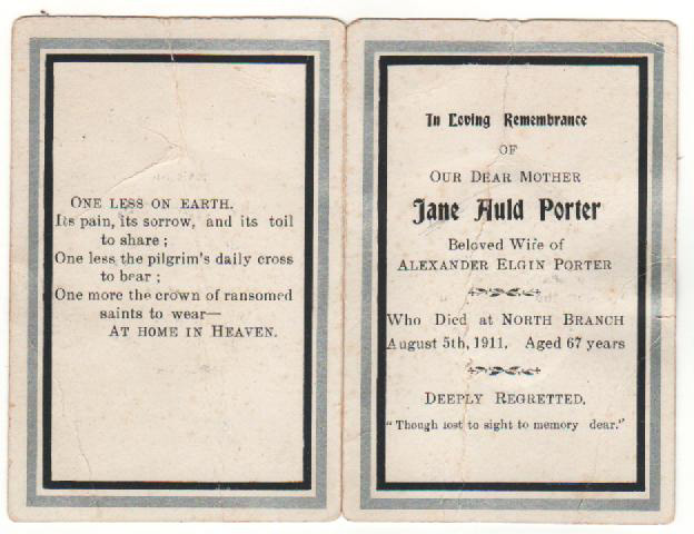 Below: Funeral card of Jane Auld Porter (1844-1911) |