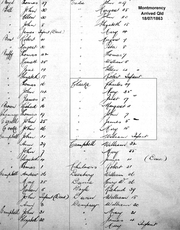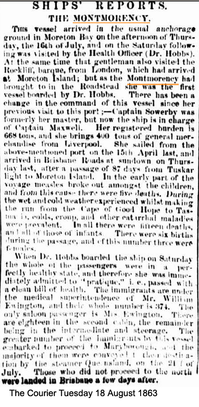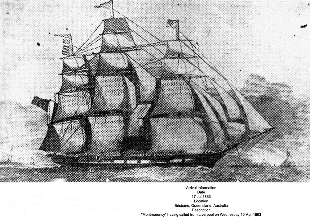 by fire in Napier, NZ. No lives lost. Charles Clarke 39 years of age Historical notes on ‘Montmorency’(19th Century Voyages to Queensland Vol 1. Record Series B Genealogical Society of Queensland, published 1985) The ‘Montmorency’ did not, strictly speaking, bring the first people out to the new state of Queensland. The 400 ton Aberdeen clipper ship ‘Leonidas’, which arrived in Moreton Bay from London on 22nd March 1860 had a Mr. Pepper on board as a passenger. Furthermore, one group of emigrants were all set to leave Plymouth, but the Emigration Commissioners could not bring themselves to use pre-separation money on passages to the new state of Queensland without further direction, and so put the would-be Queenslanders on the ‘Tudor’ which was bound for Sydney instead. Presumably, they eventually made their way north. The original notice of the first emigrant ship proper implied that the Emigration Commissioners were commissioning a new ship ‘Planet’, but by the time the Moreton Bay Courier’s shipping intelligence had more news, this had changed to the ‘Montmorency’. The ‘Montmorency’, a wooden ship variously quoted as 751 tons or 668 tons, or in Lloyd’s Register as 812 tons, was launched in Quebec in 1854, having been specially built for the Australasian trade to the order of James Baines & Co. of Liverpool. This was the Black Ball Line which brought the bulk of the States’s 1860’s immigrants, the ‘Montmorency’ herself making four voyages to Queensland and accounting for nearly 1400 new settlers. Her first voyage left Plymouth on 7th July, 1860 and arrived in Moreton Bay on 16th October, 1860, some 102 days during which one baby was born and not only three passengers died, but the second mate died of consumption. In those days, the larger ships did not come right up river to the Brisbane wharves, so the pilot, Scholl, brought the ‘Montmorency’ up to the ‘bar’. After being found by the Health Officer to be free from all infectious and contagious diseases, the ship was admitted to pratique, and the 298 immigrants were brought up to Brisbane in the steamer ‘Bremer’, to where the Police Establishment had been vacated for them. The ‘large number of people’ who had gathered at McCabe’s wharf were glad to see them in excellent health and spirits. This group of immigrants came from all over the British Isles, with 113 from England, 11 from Wales, 67 from Scotland and 99 from Ireland. The Moreton Bay Courier was pleased to judge the new arrivals to be of a useful class, and the adults among them were advertised as offered ‘for hire’ at the Depot on 22nd October. The majority found work quickly, though two families and six single men would need to make the further (free) trip to Rockhampton before starting their jobs. These probably included Owen O’Reilly and Edward Lee, both with wife and children, also Mark Swinnerton and Reece Rees, named in letters. While the immigrants were waiting to get their future settled, the single women were housed separately in the ‘ladies ward’. This caused problems to one immigrant who, having negotiated a situation for himself, was ‘anxious to tender in behalf of a fair creature with whom he had exchanged civilities during the passage’, and promptly found himself ‘apprehended for coolly and illegally intruding himself into the said ‘ladies ward’ when he wanted to talk to her.’ After later voyages, the single women seem to be put into a depot on the opposite side of the river, presumably to forestall any repetition. The offender was admonished and discharged. As with most immigrant ships, the ‘Montmorency’ brought cargo as well as passengers to Brisbane. In 1860, her manifest showed as part of a total of 300 tons lading. A rather sad finish to this historic voyage was the death of the ‘Montmorency’s master, Captain David Matthews Bridges. This left the former chief mate, Mr. Mitchell, in charge to sail back to England via Newcastle and Hong Kong, assisted by Mr. Bridges – son of the late captain – acting as chief mate. The ‘Montmorency’s second arrival at Moreton Bay was on 8th April, 1862 after a voyage from Plymouth of 91 days, this time captained by John Joseph Sowerby. She had experienced variable weather, light baffling winds interspersed with strong gales driving her off the usual course, and even being driven back southwards a considerable distance when off Sydney Heads. The passenger list has been lost, presumably in the nineteenth century floods. This leaves the Moreton Bay Courier as a main source of information, with names given for Saloon and Second Cabin passengers only, and no hint of occupation or place of origin. The dropping of the ship’s anchor was the signal for six seamen to be brought to the central lock-up and charged with broaching cargo on board ship – the liquid cargo possibly. Or as the newspaper put it ‘as is usually the case, the arrival of the (vessel) in this port was the signal for the breaking out of subordination amongst the (crew). The passengers who chose to go to England on the ‘Montmorency’ on her return voyage with a cargo of wool bales probably wished that they had stayed in Queensland. Icebergs, gales of unparalleled ferocity and blinding snowstorms accompanied them near Cape Horn. The ship lost in succession the foresail, mainsail and three topsails, followed by the three topgallant masts lost overboard, the ship’s boats smashed and the water casks washed away. Daylight found ten feet of water in the hold and both crew and passengers manning the pumps. At the end of four days of this treatment, the captain and crew had to persuade a ship under bare poles to change tack to stay clear of the rocks on Cape Ramirez. It really is a wonder that the ‘Montmorency’ survived to return in the following year. From the point of view of deaths on board, the 1863 voyage from Liverpool to Moreton Bay was the worst of the ‘Montm