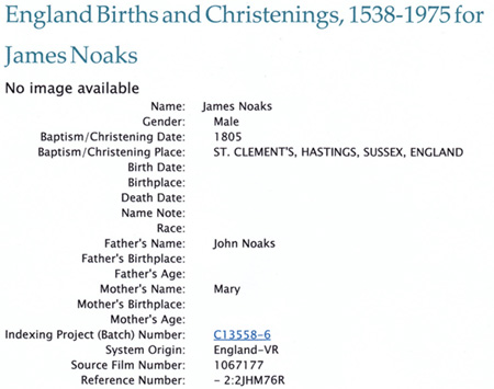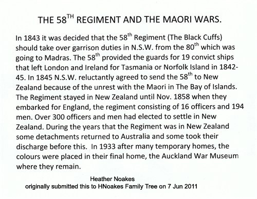 around 100 days. During their voyage, a son was born, and named James Equestrian Noakes. In 1845 Sergeant James Noakes became involved in the 1st Maori War in New Zealand, during which time his family (with 3 children - John, Mary Ann, and James Equestrian) was housed in Army Barracks in Auckland. |
