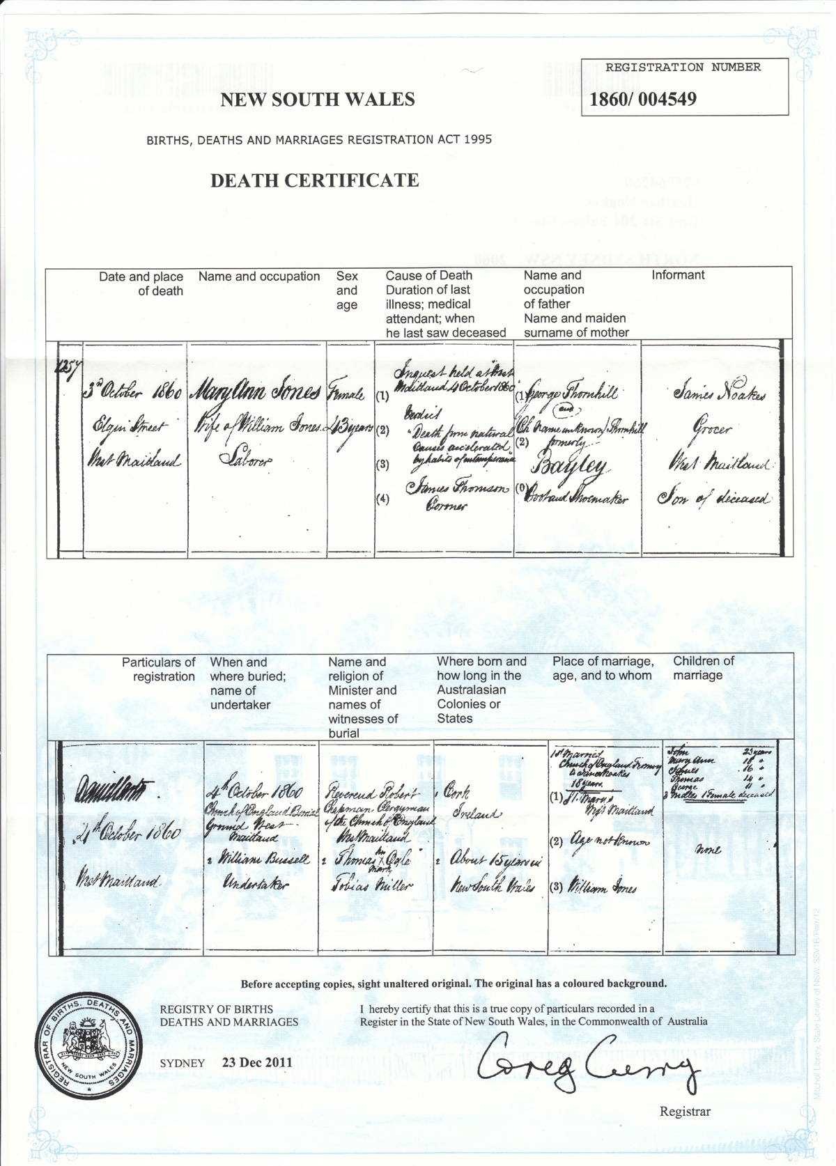 | James died in 1852 aged 46 in Maitland NSW and is buried in Campbells Hill Cemetry in Maitland together with his wife Anne (died 1860 aged 43 yrs). Her death record is under Mary Jones as she remarried William Jones and had a further son William Jones who died aged 1. | |||