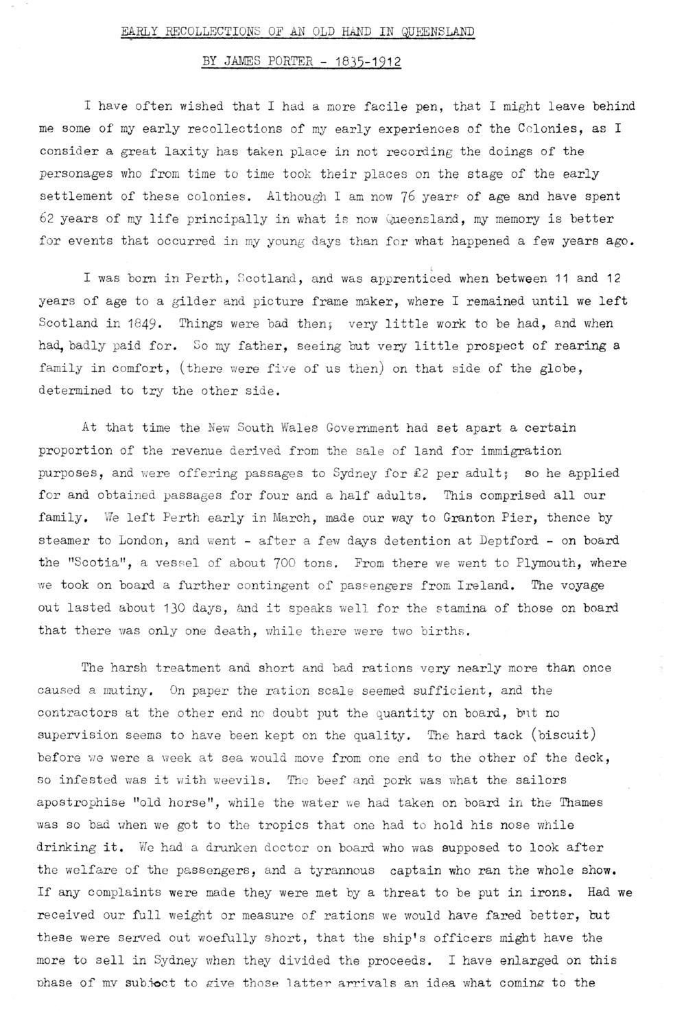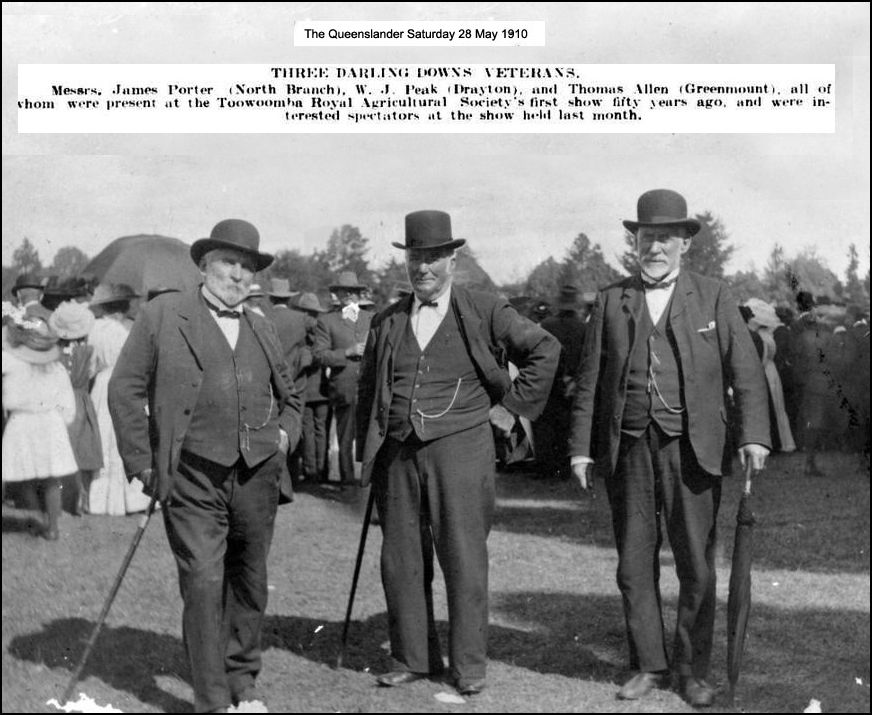 | AUGUST 29, 1912. - DARLING DOWNS GAZETTE. PASSING OF A PIONEER - MR. JAMES PORTER RECORD STRENUOUS LIFE The mournful intelligence of the death of Mr. James Porter of “ Roseneath”, North Branch, will be read with keen regret throughout the whole of the Darling Downs, where the grand old pioneer was so well known and so highly esteemed. The deceased gentleman, who had been ailing for some weeks past, came to reside in Toowoomba, and was about until a few days ago. An affection of the heart, however began to assert itself, and yesterday morning he began to sink and the end came slowly but with a dread certainty. Rallying for some minutes, he recovered consciousness, but at about 3am. sank to that rest that knows no further toil or sorrow. Surrounded by members of his sorrowing kin – one of his sons having ridden from Nanango – another leader among the men who had blazed the track, passed beyond the boundary line to the Great Infinity. The body of the deceased gentleman was taken to the Pittsworth train in the afternoon of yesterday, to find its last resting the quiet little cemetery at North Branch, where the brave spirit while present battled so well to furnish an object lesson in subduing the primeval wastes to those who lived to read and learn, for wherever the list of Downs pioneers is published the name of James Porter will find a foremost place, and not only on the Downs but throughout the entire State. A wide circle of friends and admirers will mourn with us the “one clear Call” that has summoned to the Beyond a gentleman whose courage, intelligence and endurance have left their marks on the storm-laden history of our early colonization and extend with us, to his mourning relatives and friends that heartfelt and soulful sympathy which the kindly friendship of a lifetime ever commanded. The funeral will take place from the Masonic Hall Pittsworth at 10am today, and interment will take place at North Branch in the family Cemetery About six years ago at the request of the proprietary of this paper, Mr. Porter kindly furnished us with a history of his early life in Queensland, which is subjoined below. |