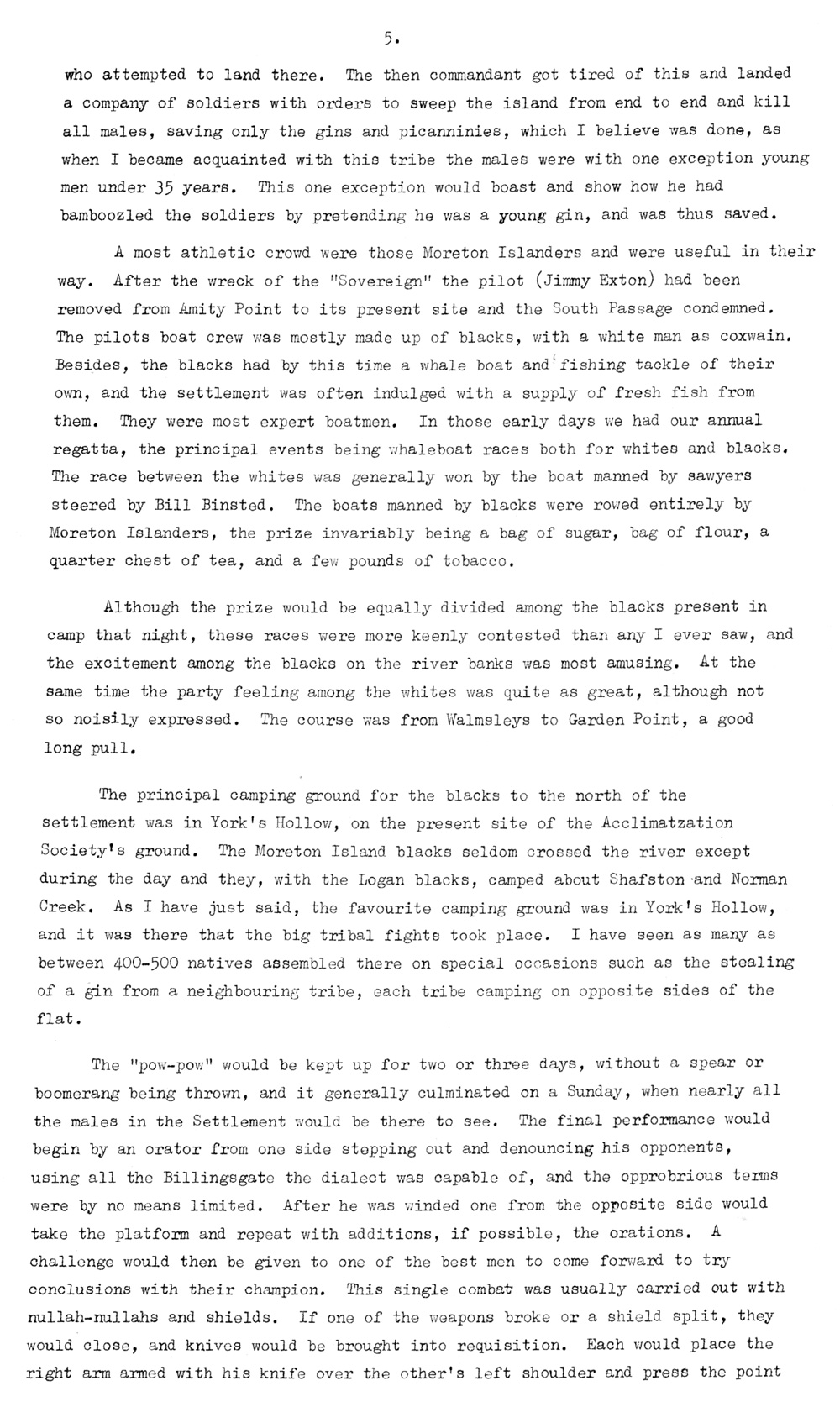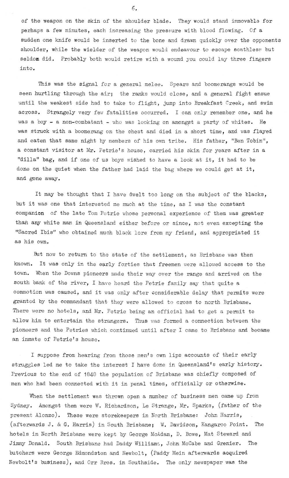 | CEDAR GETTING ………… getting cedar near Wivenhoe and brought down the first raft from the upper Brisbane. This we got into the tide water on New Year’s Day’58 but father caught a cold from being constantly on the water for three months and died in the following March. After this Sandy and I began cutting up the cedar and delivering it in Ipswich, but as we could not get paid we gave it bust. At that time a rush set in from Ipswich to a diggings on Tooloom the upper waters of the Clarence, and having nothing better to do we started away, humping bluey again. After being there for six weeks and finding nothing but starvation (we had been living on split peas instead of flour for nearly a month), and the shearing beginning on the Downs we made for Warwick. We followed on the tracks of Patrick Leslie most of the way and passed through the most beautiful farmland I have ever encounted in this country. Sandy and I promised ourselves that if ever we “struck it rich” this was where we would make our homes and settle down, (This promise was fulfilled eleven years later, when Sandy, Bob and myself filed our first selection of 320 acres at North Branch under the 1868 Act.) There was no……… |