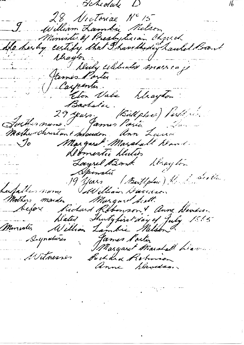 | Below: Marriage certificate of James Porter and Margaret Marshall Davidson | ||||||