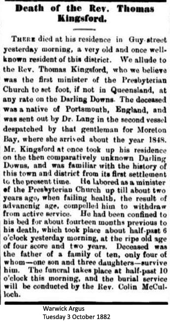 In those early days, Thomas Kingsford tended to move his base from place to place - to Clifton Station (probably in 1851), back to Warwick, then to Toolburra while his house was being built at Warwick. Rev. Kingsford and Parson B. Glennie of the Anglican Church, were two